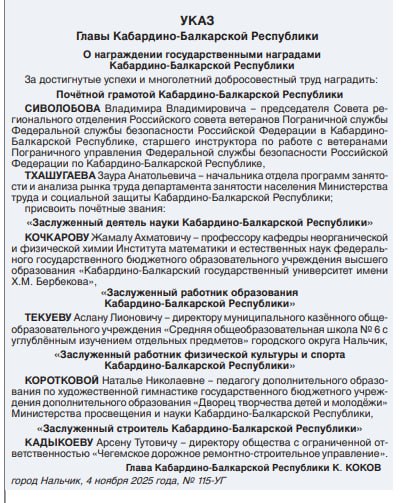 Указом Главы Кабардино-Балкарской Республики К.В. Кокова №115-УГ от 4.11.2025г. за достигнутые успехи и многолетний добросовестный труд в системе образования КБР Текуеву Аслану Лионовичу, директору МКОУ «СОШ №6, присвоено почетное звание «Заслуженный работник образования Кабардино-Балкарской Республики». Более 35 лет Текуев Аслан Лионович работает в системе образования. Трудовую деятельность начал в 1986 г. старшим пионерским вожатым МКОУ «СОШ №12» г. Нальчика. С марта 2016г.- директор МКОУ «СОШ №6» г.о.Нальчик. Текуев А.Л. является победителем республиканского этапа XIII ежегодного Всероссийского конкурса в области педагогики, воспитания и работы с детьми и молодежью до 20 лет «За нравственный подвиг учителя». Член Общественной палаты КБР. Награжден Благодарностью Президента РФ, Грамотами Правительства КБР, Парламента КБР, Благодарностью Главы КБР, является почетным работником общего образования РФ. Имеет классный чин действительного государственного советника КБР 3 класса. Поздравляем! Гордимся!